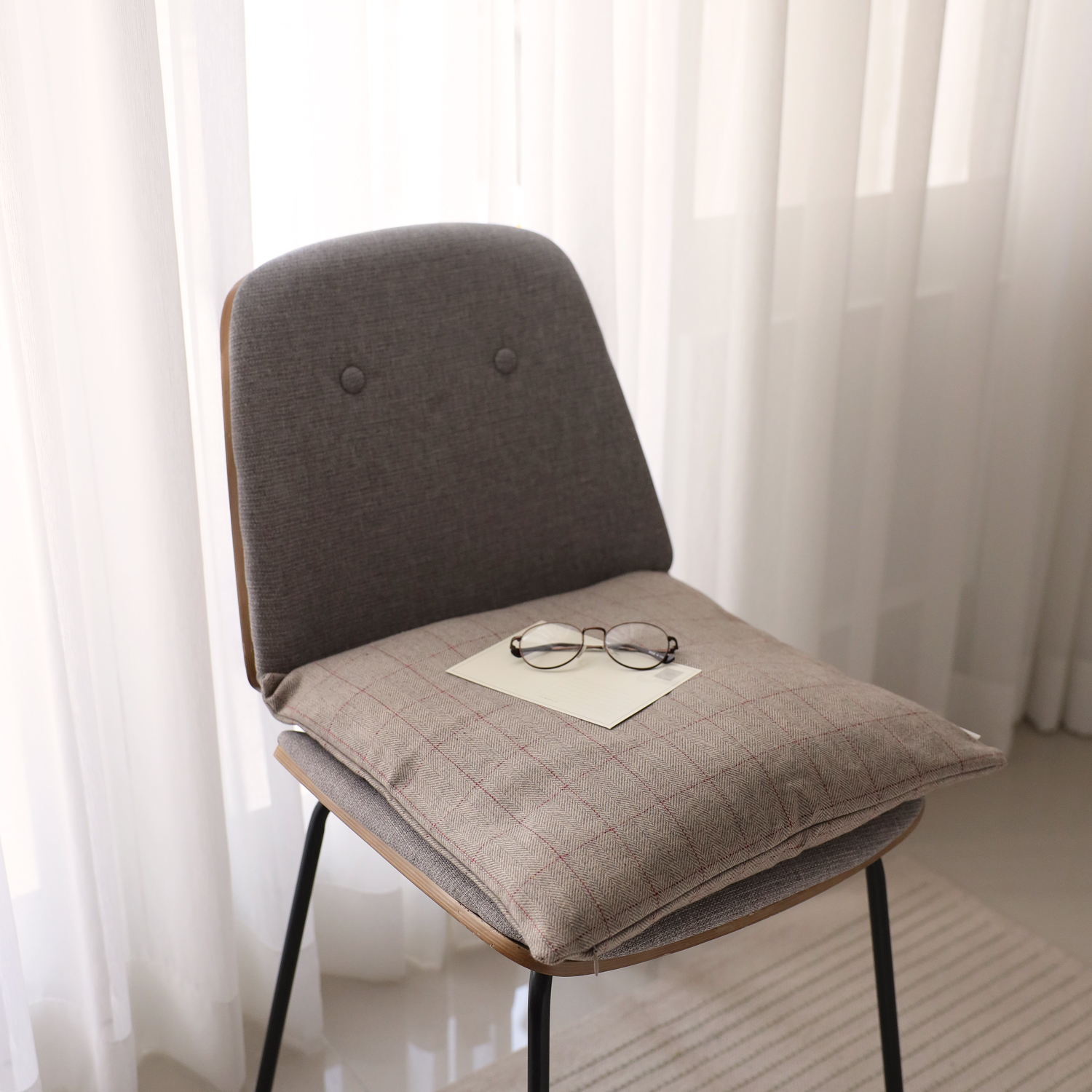 4번 그레이 체크 쿠션은 따뜻한 연회색 바탕에 화이트와 블랙