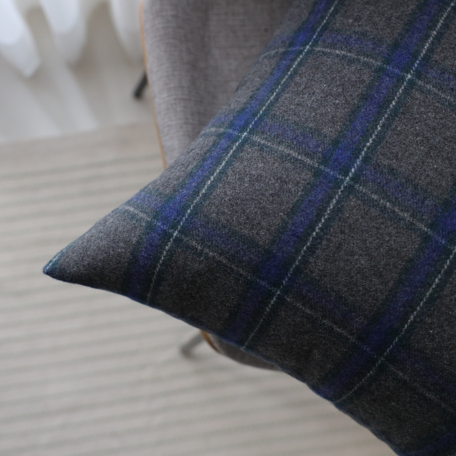 3번 런던블루 체크 쿠션 중회색 바탕에 은은한 크림베이지와 쾌활한  블루 격자 무늬로