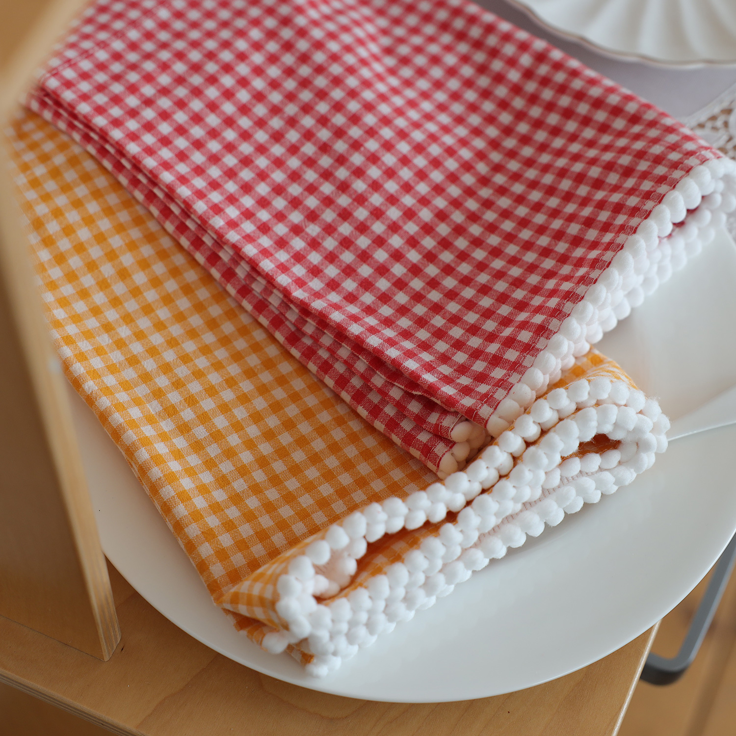 레드/옐로우 2color 체크패턴에 밑단은 화이트 폼폼 트리밍