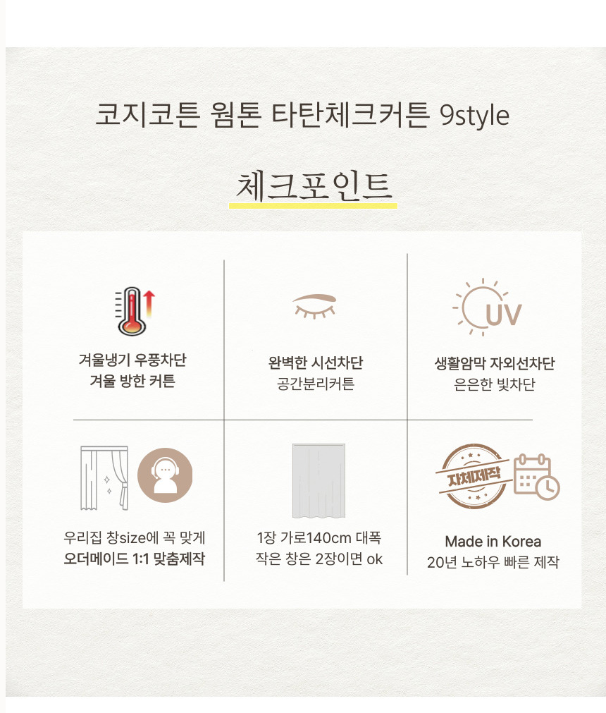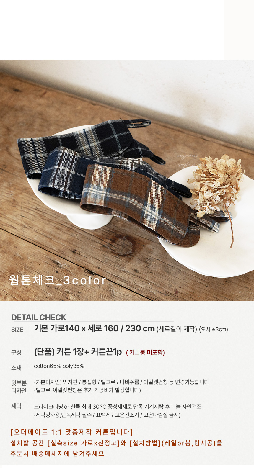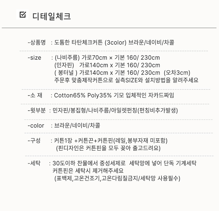 | 치수 | [주문후 맞춤제작] 커튼1장(민자핀) 가로140cm*160/230(옵션선택) |