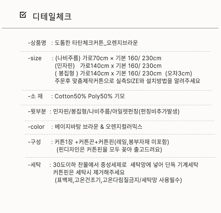 | 치수 | [주문후 맞춤제작] 커튼1장(민자핀) 가로140cm*160/230(옵션선택) |